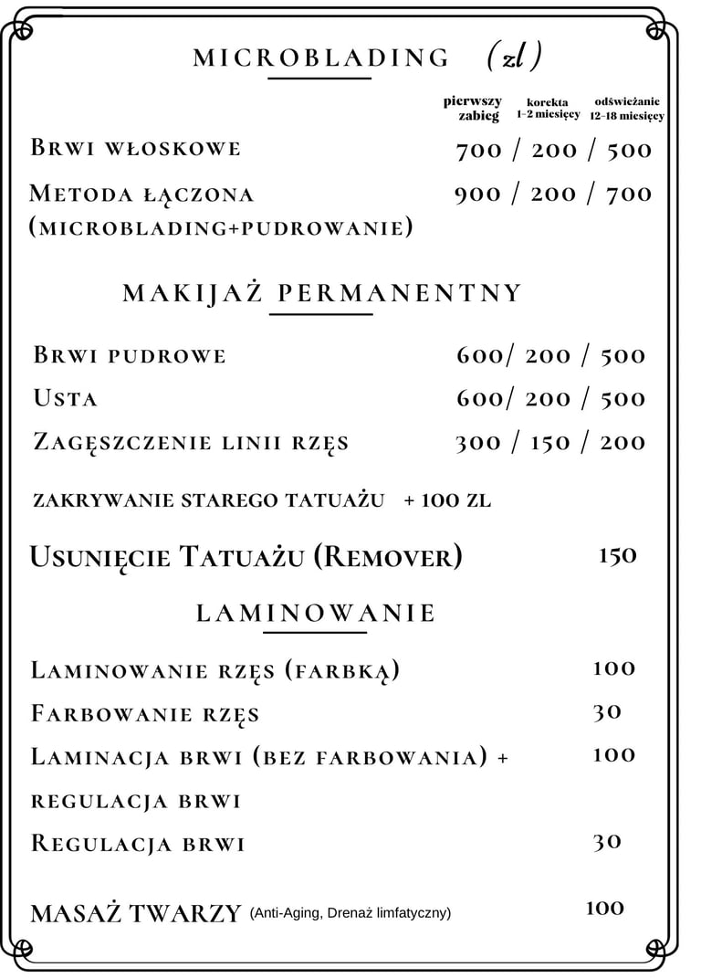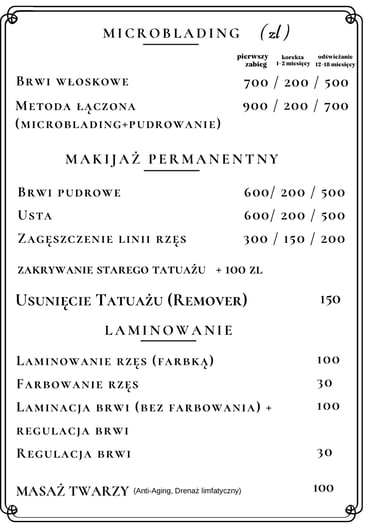 Zapraszam do zapoznania się z moim cennikiem usług makijażu permanentnego i microbladingu. Oferuję profesjonalne usługi, które podkreślą Twoje naturalne piękno i sprawią, że będziesz czuć się pewnie i pięknie przez wiele lat. Moje usługi są wykonywane tylko za pomocą naturalnych i bezpiecznych metod, aby zapewnić Ci trwały i efektowny makijaż.
